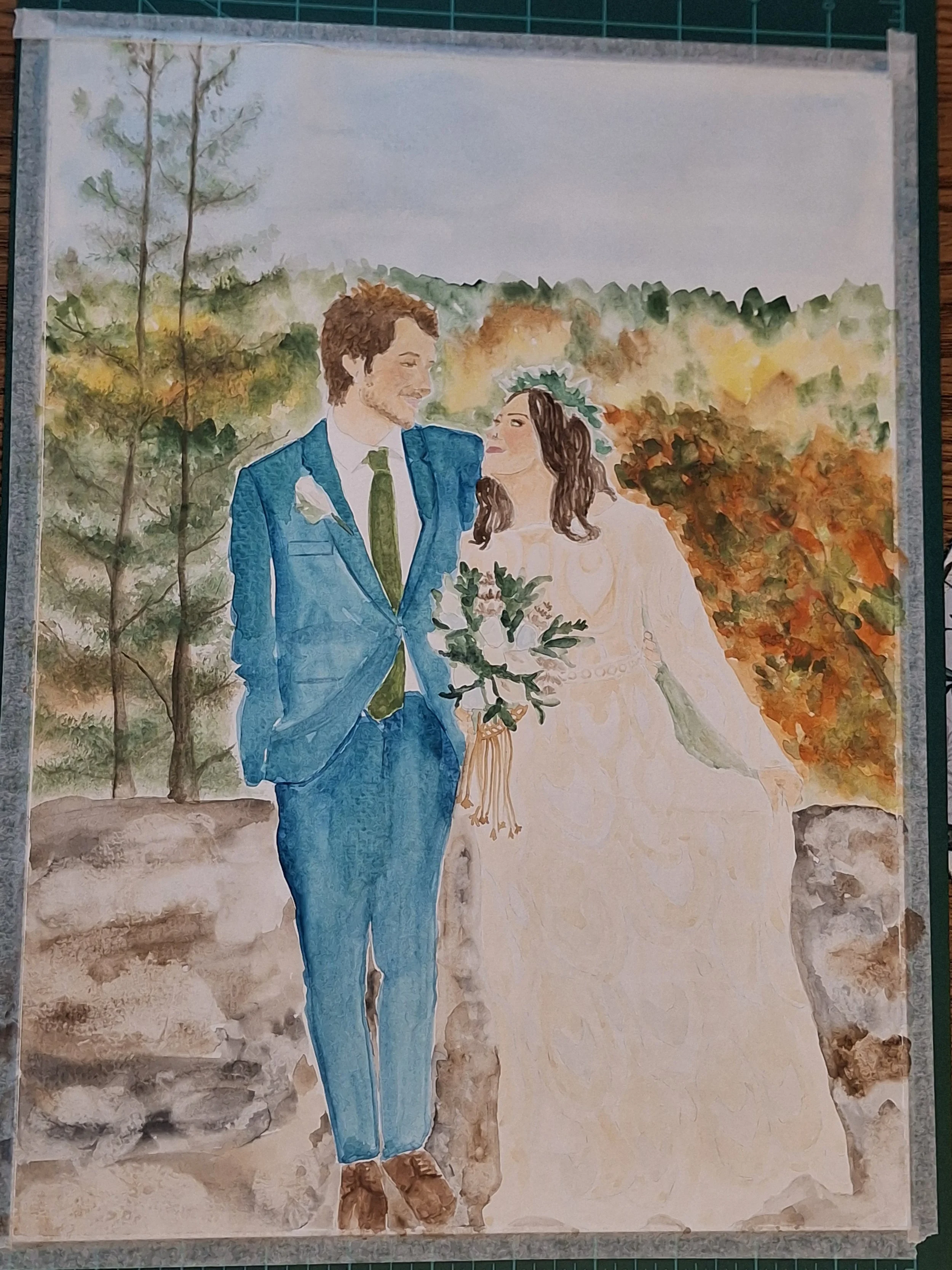 I like to arrive at least an hour before any guests arrive. This allows me to set up, take the needed photos of the happy couple, and get started! I paint throughout the evening. I like to be placed somewhere I won’t be bumped into, but everyone is able to stop by and watch the process unfolding. Painting in watercolor does allow me to potentially send the completed portrait home with you that night!